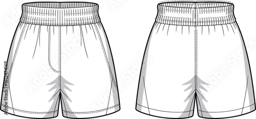 PrintCasual athletic shorts front and back mockup, elastic waistband detail, stylish unisex sportswear design, comfortable fit apparel illustration template
