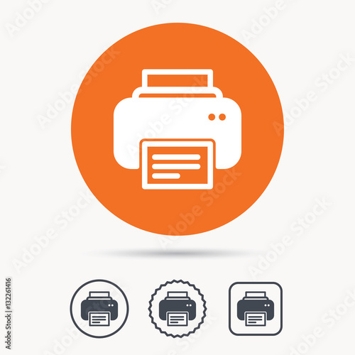 Printer icon. Print documents technology symbol. Orange circle button with web icon. Star and square design. Vector
