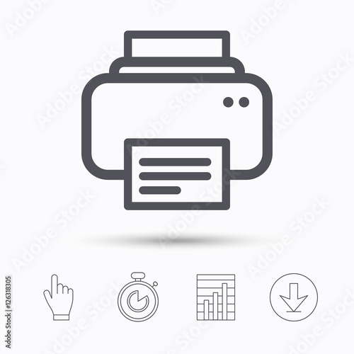 Printer icon. Print documents technology symbol. Stopwatch timer. Hand click, report chart and download arrow. Linear icons. Vector