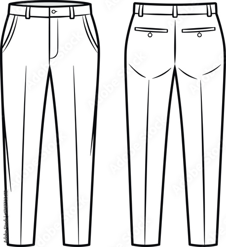 PrintMen’s classic pants front and back view, fashion flat sketch, trouser technical drawing, apparel design template, clothing illustration, garment outline, vector art