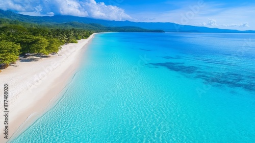 Pristine Beach Paradise - Tropical beach, turquoise water, white sand, lush greenery, sunny day. Represents serenity, escape, relaxation, adventure, beauty.