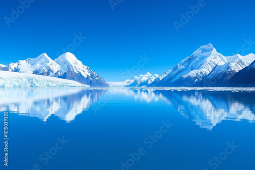 Pristine glacial landscape reflecting snowy mountains and clear skies in a tranquil blue lake