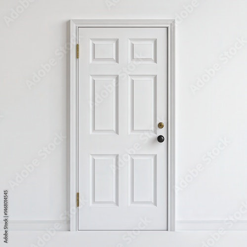 Pristine white interior door with black doorknob and gold hinges against a white wall