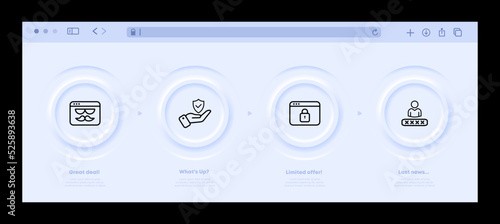 Private data protection set icon. Incognito tab, website, hand, shield, antivirus, antihacking, password, user. Privacy concept. Neomorphism website interface. Vector line icon for Advertising