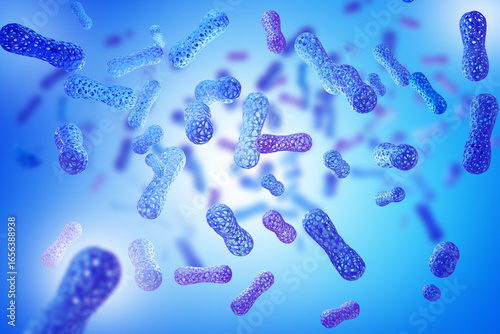 Probiotic background. Microbiology in human body. Probiotic cells on blue. Microbiome in body. Probiotic backdrop. Beneficial microorganisms. Intestinal microflora. 3d rendering.