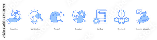 Problem Prevention icon sheet web banner vector reduction, identification, research, proactive, standard, hypothesis, customer satisfaction