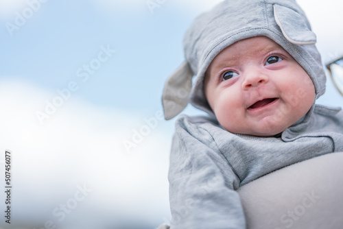 Professional baby photography outdoors. Baby child portrait towards blue sky. Joyful and happiness concept.