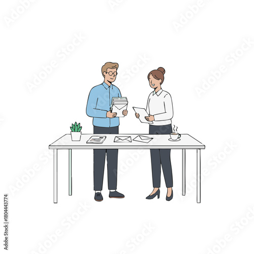 Professional colleagues, a man and a woman, collaborating on business documents and administrative tasks at a desk, showcasing effective teamwork and workplace communication