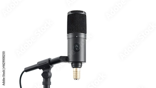 Professional dynamic microphone isolated on white background with a close-up view of XLR connector.