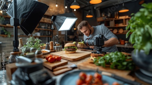Professional food photographer taking a photo of a freshly made burger in a well-equipped kitchen with studio lighting and camera setup.