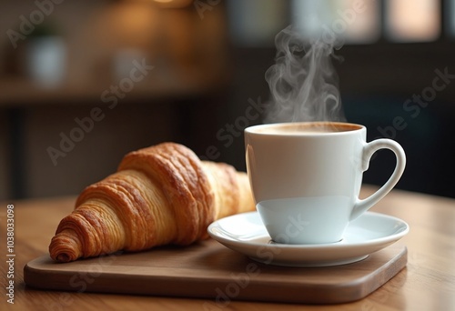 Professional food photography of A cup of coffee and a croissant on a wooden table