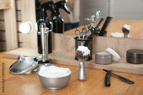 Professional hairdresser set for men on table in salon