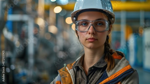 Professional Heavy Industry Engineer Worker Wearing Uniform, Glasses, and Hard Hat in a Steel Factory. Portrait of a Beautiful Female Industrial Specialist Standing in a Metal Construction Facility.