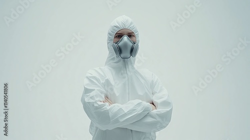 Professional in protective gear wearing respirator