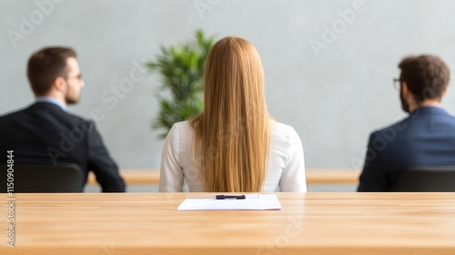 Professional Job Interview Setting with Three Individuals, Focus on Female Candidate in Front of Two Male Interviewers, Modern Office Background