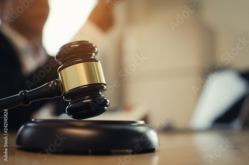 professional justice lawyer in black suit working about legal legislation and pointing finger in courtroom office behind wooden judge gavel, occupation, business, justice law and legal service concept