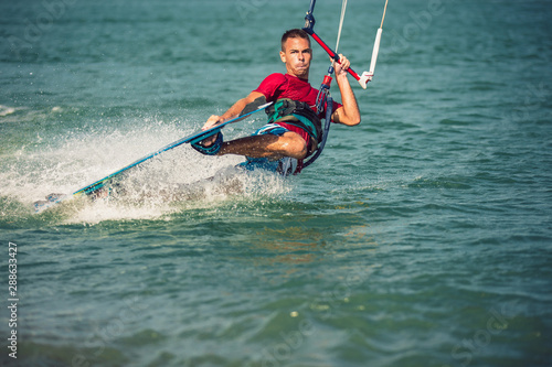 Professional kiter makes the difficult trick on a beautiful background. Kitesurfing Kiteboarding action photos man among waves quickly goes