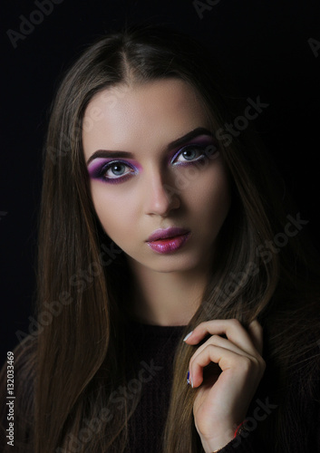 Professional makeup. Makeup brushes. Make-up artist doing make-up. Blue-eyed girl.