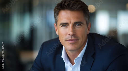 Professional man smiles while seated in a contemporary office environment, showcasing confidence