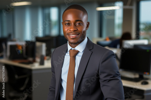 Professional man wearing suit and tie standing confidently in office. This picture can be used to depict professionalism, business, and corporate environments.