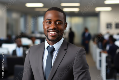 Professional man wearing suit and tie standing in office. This picture can be used to depict businessman or professional in corporate setting.