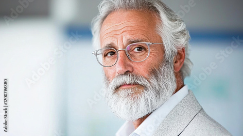 Professional older man with glasses and beard, looking serious