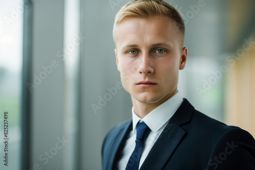 Professional portrait of a young businessman in a suit, standing in an office.