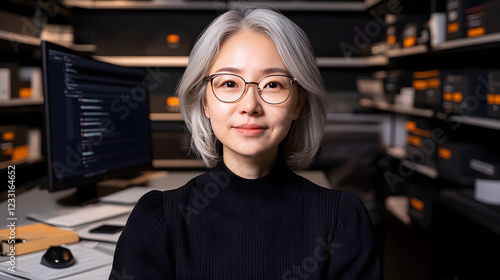 Professional senior woman with gray hair working on software development in a high-tech office environment, UHD 4K Image.