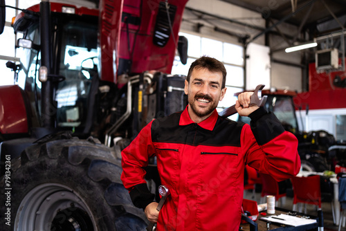 Professional serviceman with tools standing by tractor machine with hood opened.