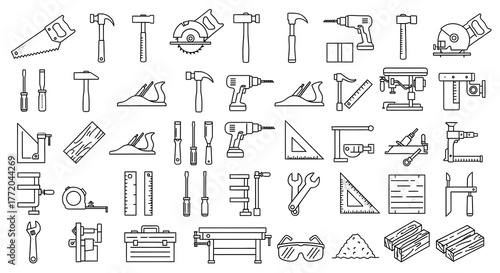 Professional workshop collection featuring essential tools and equipment for crafting and construction projects.