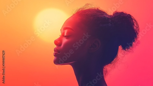 Profile view of a person, warm color gradient, sunlit, peaceful pose.