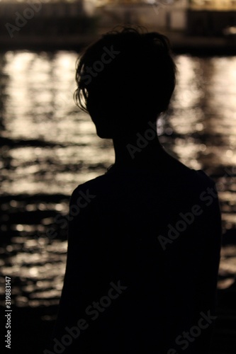 profilo di donna, in controluce sui riflessi notturni sull'acqua