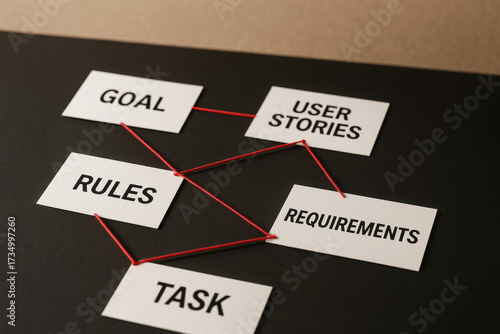 Project management workflow concept with goal, rules, user stories, requirements, task connection diagram on black desk