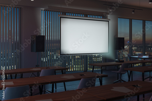 Projector screen canvas in modern conference room with big windows and turned on projector. 3d rendering.