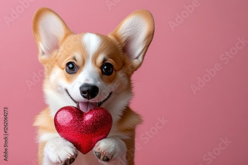 Promotion idea art. Cute pembroke welsh corgi doggy with sparkling rhinestones red heart - sign of love, funny greeting card. Pembroke welsh corgi - my desired dog. Puppy valentine photos.