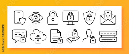 Protection set icon. Private information, vindication, bulwark, advocacy, password, antivirus, hacker, two factor protection, shield, lock, defense. Security concept. Vector line icon for Business
