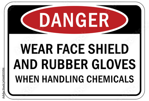 Protective equipment sign and labels wear face shield and rubber gloves when handling chemicals