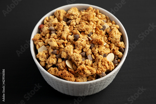Protein Granola with hazelnut, almond, and chocolate in a Bowl, side view.
