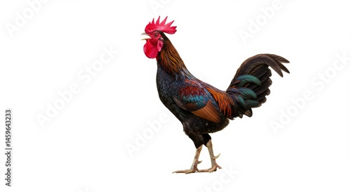 Proud Rooster Crowing Loudly Isolated on White Background Stock Photo Perfect for Farm Animal Illustrations and Poultry Farming Concepts with Vibrant Plumage and Detailed Features