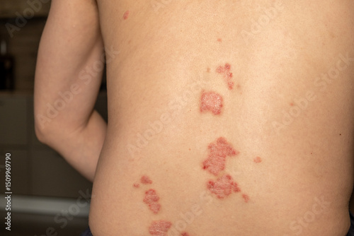 Psoriasis skin patches on a persons back indicate a chronic immune condition affecting appearance and comfort