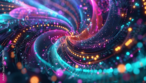Psychedelic 3D model of vibrant data particles swirling through an electronic circuit