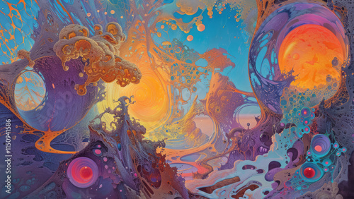 Psychedelic cosmic landscape with vibrant colors and abstract shapes