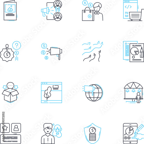 Publicity company linear icons set. Promote, Visibility, Exposure, Outreach, Advertise, Campaigns, Branding line vector and concept signs. Media,Press,Hype outline illustrations
