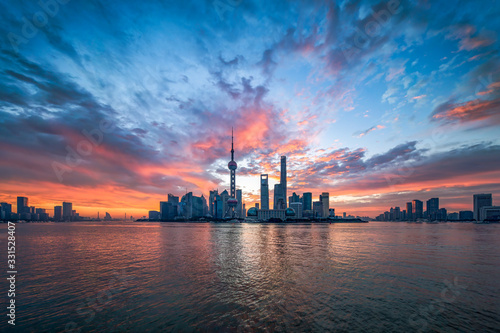 Pudong skyline at sunrise with Oriental Pearl Tower, Shanghai, China