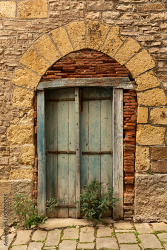 Puerta de madera antigua de color azul.