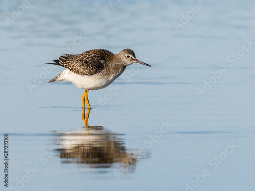 Puffed Lesser Yellowlegs with Reflection Foraging on the Pond in Blue Water