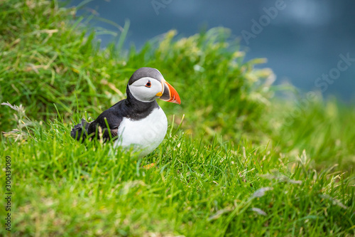 Puffins on Mykines cliffs and atlantic ocean. Mykines island, Faroe Islands, Europe.