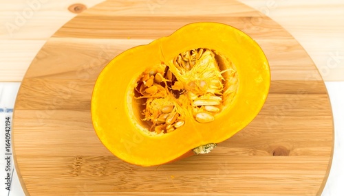 Pumpkin cut in half on wooden board