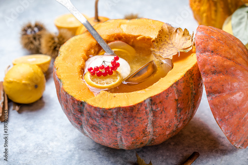 Pumpkin punch or sangria in a big pumpkin. Halloween and Thanksgiving. Traditional autumn, winter drinks and cocktails