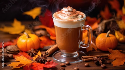 Pumpkin spice latte in a clear glass mug with cinnamon sticks and autumn leaves around